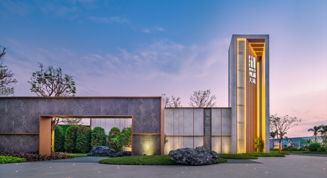 金属流线勾勒刚劲石材,铁瀑沿墙潺潺而落,是入口处的点睛之笔。夜晚灯光点亮,它便是归家之路的指明灯,一眼望去自然安定。
