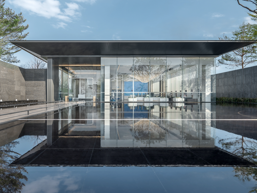 极简主义的镜面水景,倒映出“杭派精工”引以为傲的超大窗墙比建筑。