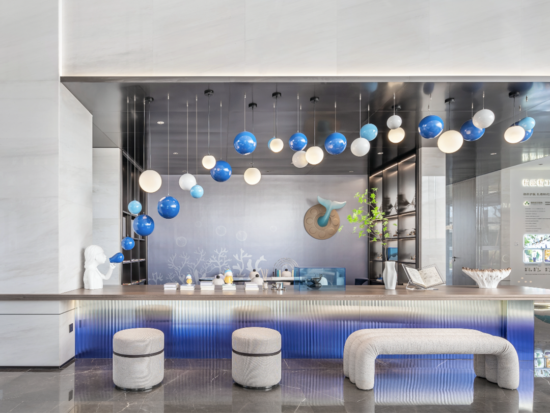 “海上丝绸之路”为灵感来源的设计巧思,贯穿在各个角落:水滴造型的沙盘吊灯、融合海豚与白鹭意象的雕塑、悬浮空中的蓝白色泡泡……