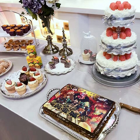 影城内设有茶歇,一枚枚蛋糕为影城开业增添了甜蜜的氛围,更有《航海王之黄金城》的海贼王主题蛋糕以及现场COSPLAY主角人物来庆祝影城开业。