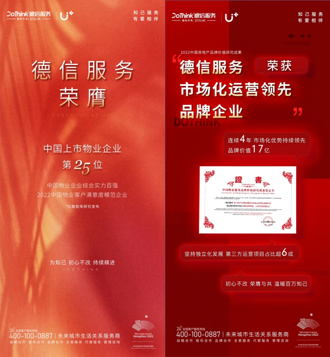 在近日举行的“2022中国房地产品牌价值研究成果发布会”上,德信服务连续第四年荣获“中国物业市场化运营领先品牌企业”称号,第三方外拓能力再获肯定。此外,凭借精益化的管理和良好的品牌运营,德信服务也成功收获“2022中国物业服务特色品牌企业”称号。