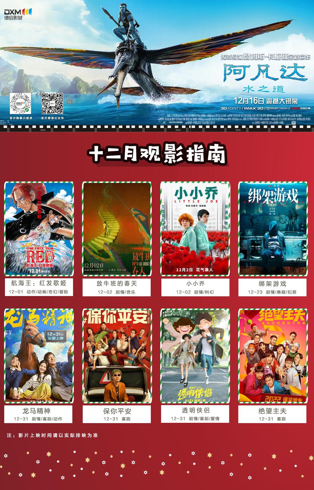 万众期待的《阿凡达2》将于12月16日震撼大荧幕!除此之外,12月更是好片齐聚,《航海王:红发歌姬》带你奇幻冒险;《放牛班的春天》经典再现,温暖师生情疗愈心灵; 《2067》讲述在地球上被气候变化破坏后,人类展望未来寻找答案的故事;还有《小小乔》、《绑架游戏》、《龙马精神》、《保你平安》、《透明侠侣》、《绝望主夫》精彩不断!这个周末,快来德信影城观影吧!