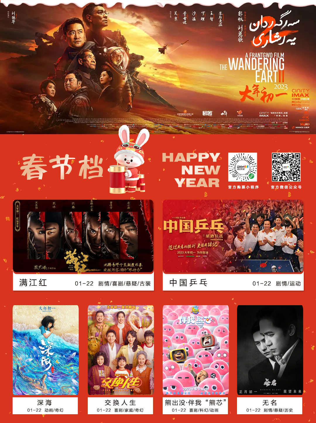 春节档七部大片集结!大年初一霸气开年!“流浪”启程 绽放希望《流浪地球2》、迷局深藏 悬案待破《满江红》、永不放弃 涅槃重生《中国乒乓之绝地反击》、谍战对决 暗流涌动《无名》、奇“换”之旅 欢乐爆笑《交换人生》、生命色彩 鲜活瑰丽《深海》、熊强组合 趣味十足《熊出没·伴我“熊芯”》,多种类型的大片齐齐上线,快带上家人朋友一起来德信影城看春节大片吧!